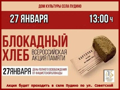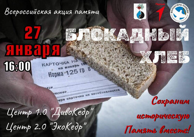 Приглашаем всех жителей города Кедрового принять участие в важном событии! 27 января на общественных пространствах нашего города пройдет акция "Блокадный хлеб", посвященная памяти жертв блокадного Ленинграда.