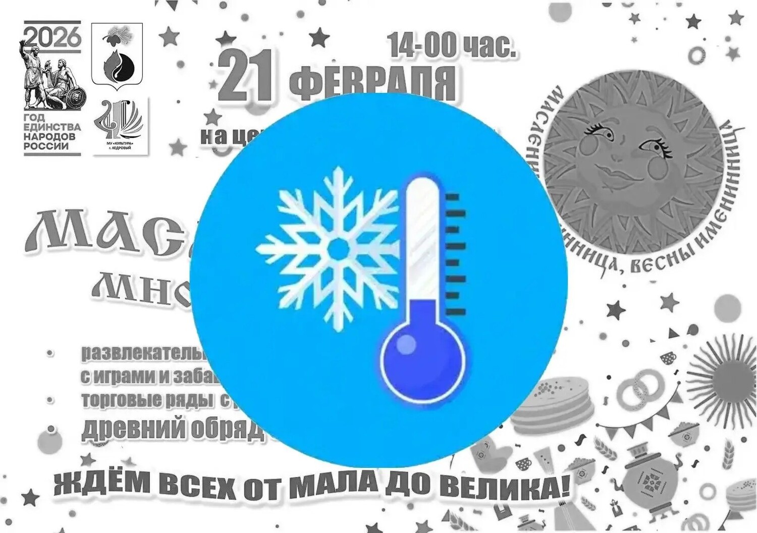 К сожалению, уличные мероприятия, посвящённые Масленице и запланированные на 21 февраля в г. Кедровом и 22 февраля в с. Пудино, ОТМЕНЯЮТСЯ из-за неблагоприятных погодных условий.