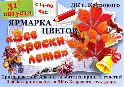 Приглашаем кедровчан и жителей села принять участие в ярмарке цветов «Все краски лета», которая пройдет 31 августа с 14-00 до 16-00 час. на крыльце Дома культуры г. Кедрового.
