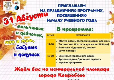 Приглашаем всех-всех-всех на праздничную программу, посвящённую началу нового учебного года! Поверьте, вам некогда будет скучать! Чтобы этот день стал незабываемым, мы подготовили для вас множество сюрпризов.