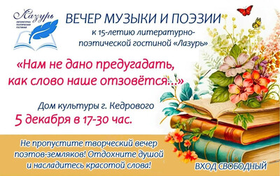Друзья! Приглашаем вас на торжественный вечер, посвящённый 15-летию литературно-поэтической гостиной «Лазурь»!