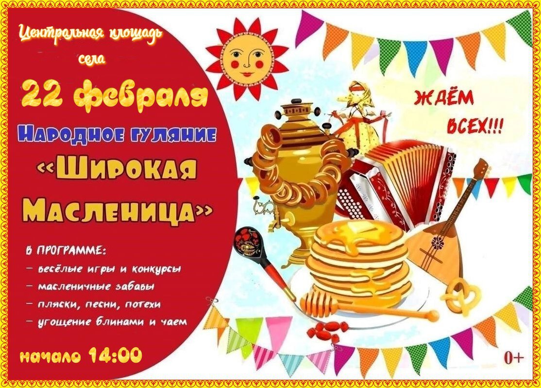 22 февраля мы приглашаем всех вас, дорогие друзья, от мала до велика, окунуться в атмосферу настоящего русского раздолья и веселья.