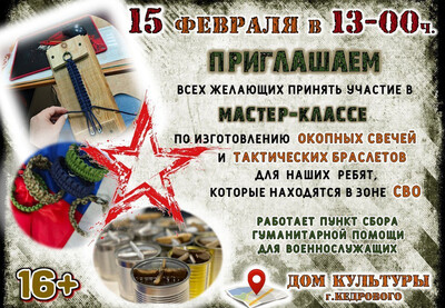 Волонтеры и специалисты МУ «Культура» проведут 15 февраля в 13:00 ч. мастер-классы по изготовлению тактических браслетов из паракорда и изготовлению окопных свечей.