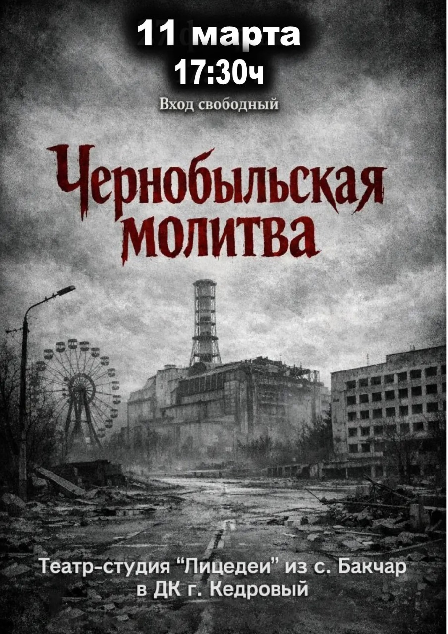 Завтра, 11 марта, в Доме культуры г.Кедрового театр-студия «Лицедеи» из соседнего Бакчара представит постановку, пробуждающую память о трагических событиях XX столетия. В преддверии 40-й годовщины аварии на Чернобыльской АЭС, творческий коллектив черпал вдохновение в пронзительной книге Светланы Алексиевич «Чернобыльская молитва».